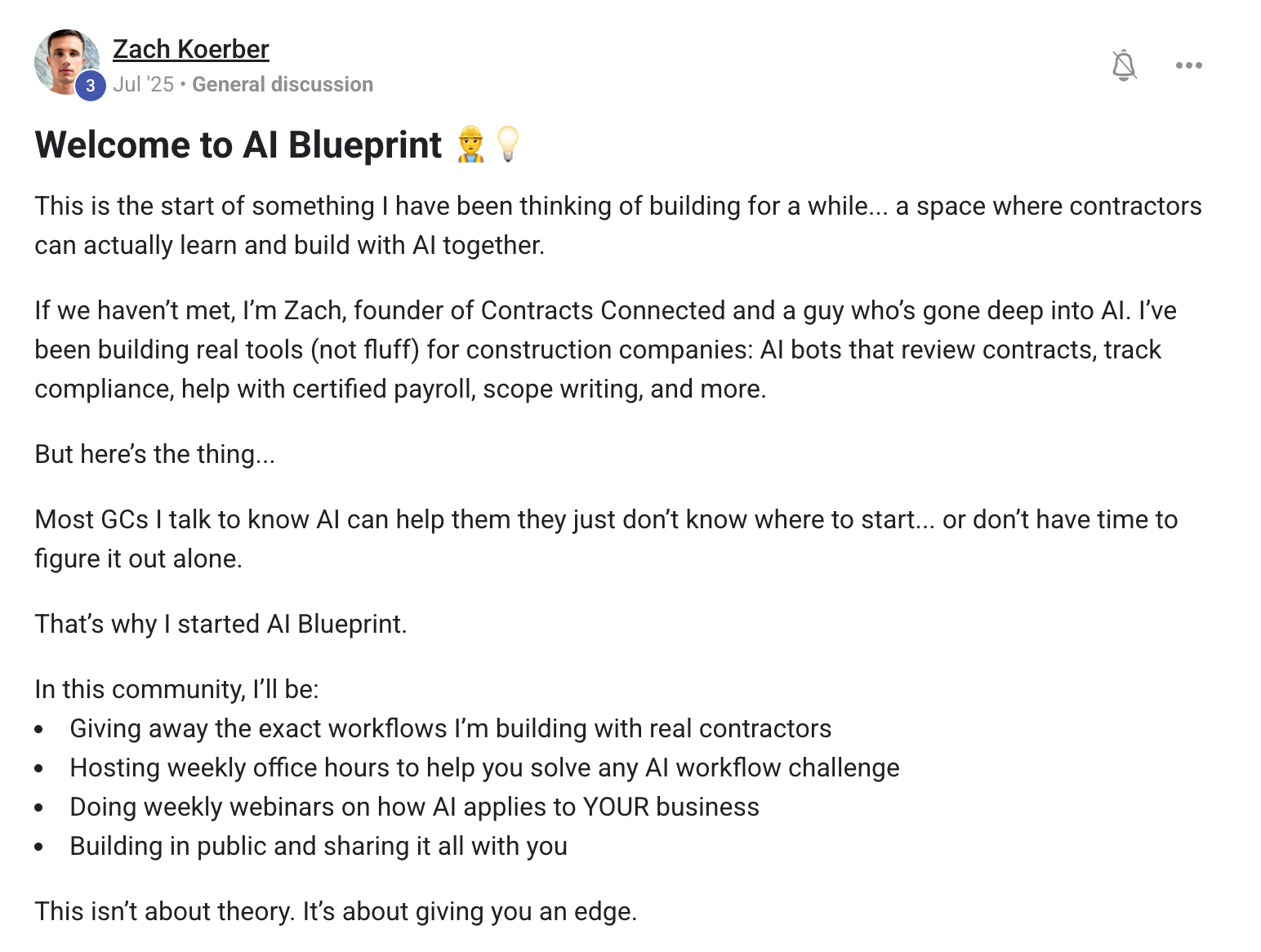 This week’s ConTech Corner, isn’t a software tool, but rather a Skool community built by Zach Koerber from Contracts Connected, called the AI Blueprint.